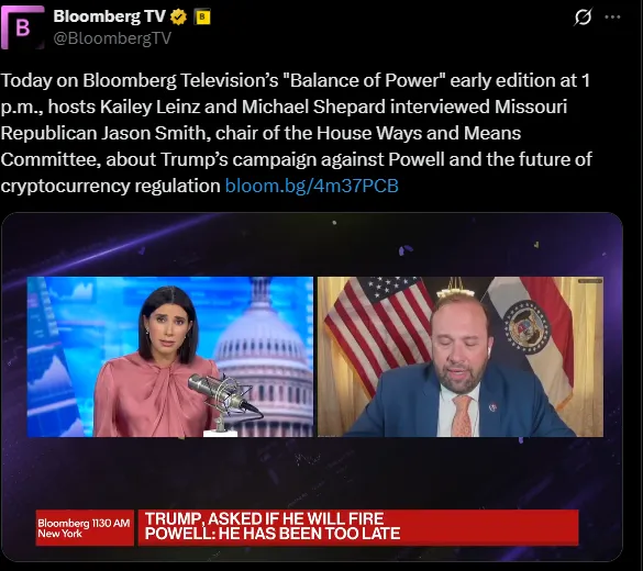 今天下午1點彭博電視台權力平衡早間節目中,主持人凱莉·萊因茨和邁克爾·謝潑德採訪了密蘇里州共和黨人、眾議院籌款委員會主席傑森·史密斯,討論了特朗普針對鮑威爾的競選活動以及加密貨幣監管的未來。