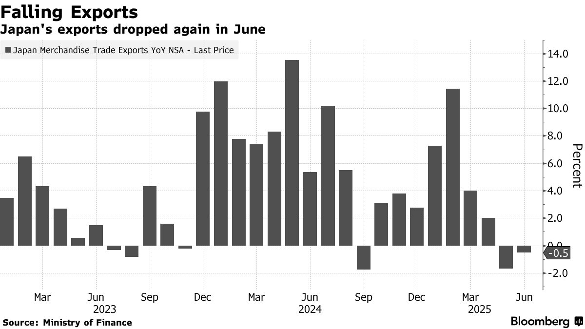 隨着美國關税政策持續對貿易施壓,日本出口連續第二個月下滑,這進一步增加了技術性衰退的風險。此前日本經濟在今年初已出現萎縮。
