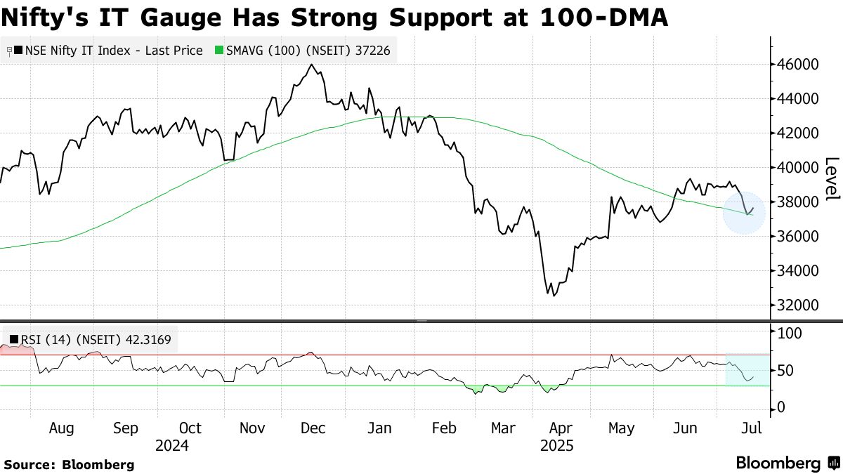 軟件出口商仍是表現最差的板塊,Nifty IT指數已連續三個季度表現遜於大盤基準。財報季的疲軟開局更是雪上加霜。從技術面來看,市場普遍認為該行業指數將在100日移動均線附近獲得強勁支撐。14日相對強弱指數(RSI)顯示該指標徘徊在超賣區域附近,表明短期下行空間可能有限。