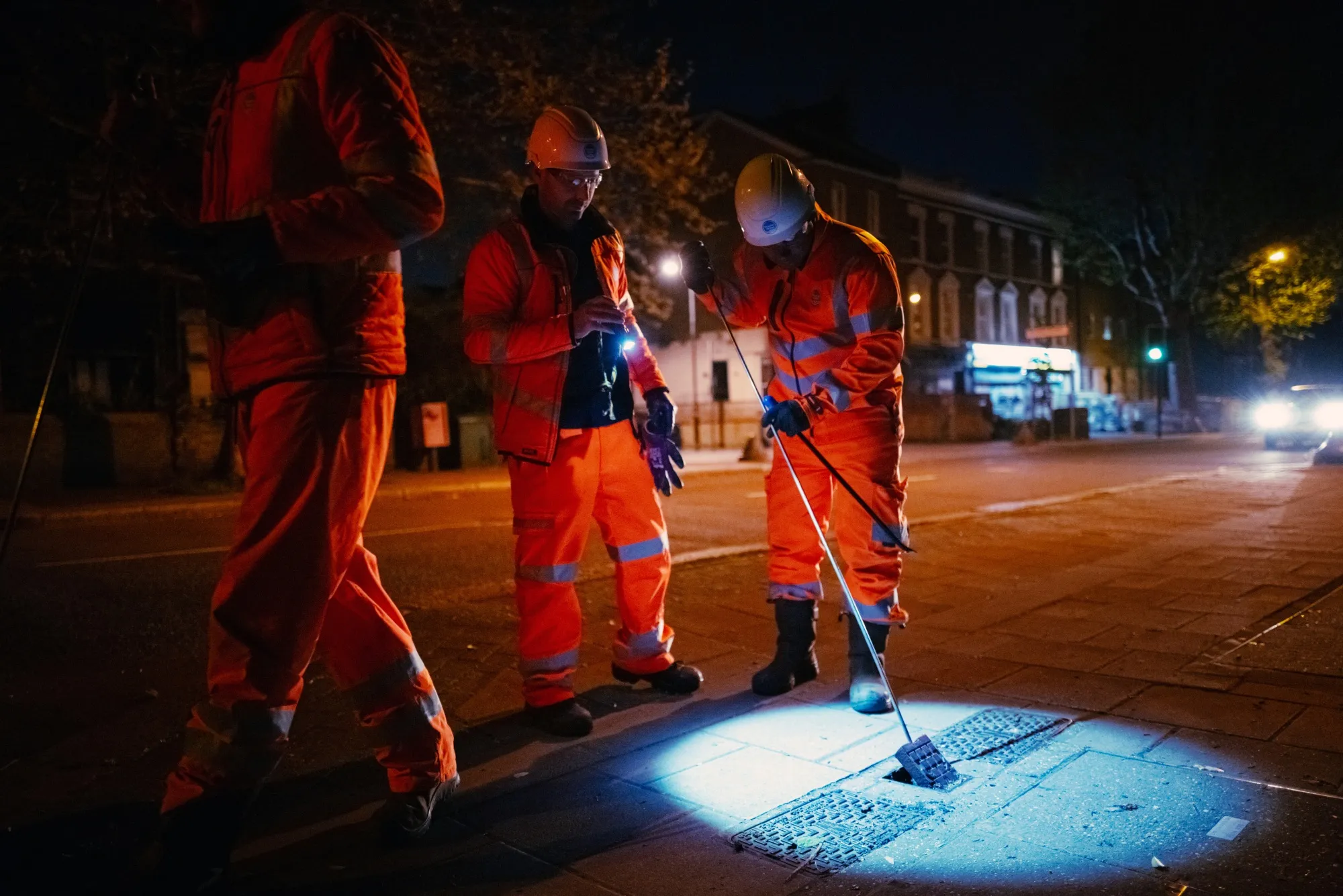 泰晤士水務公司漏損排查小組的工程師們在倫敦進行夜間作業。