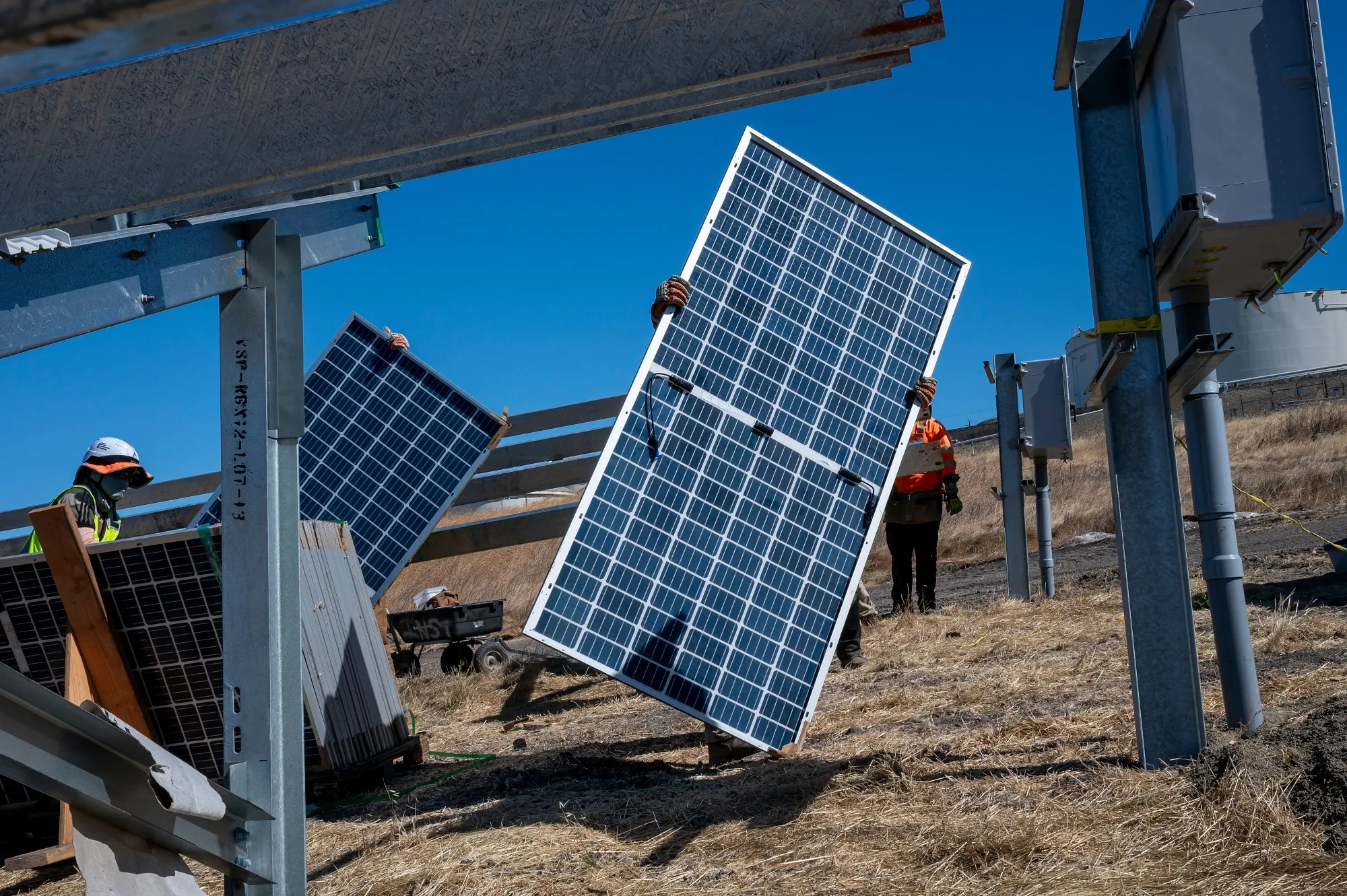 2024年,工人們正在加利福尼亞州羅迪歐的菲利普斯66可再生能源園區安裝太陽能電池板。