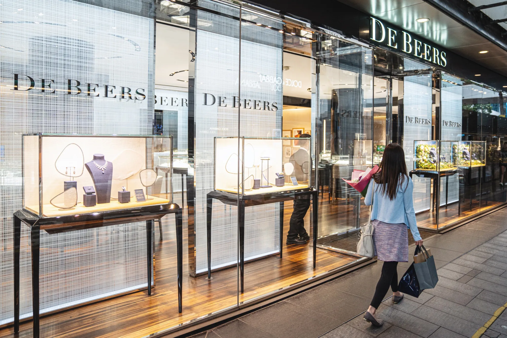 香港一家戴比爾斯奢侈品珠寶店。攝影師:林易/Bloomberg英美資源集團對戴比爾斯出售事宜的處理激怒了博茨瓦納,該國擁有這家鑽石生產商15%的股份,知情人士稱,政府認為未得到充分協商。