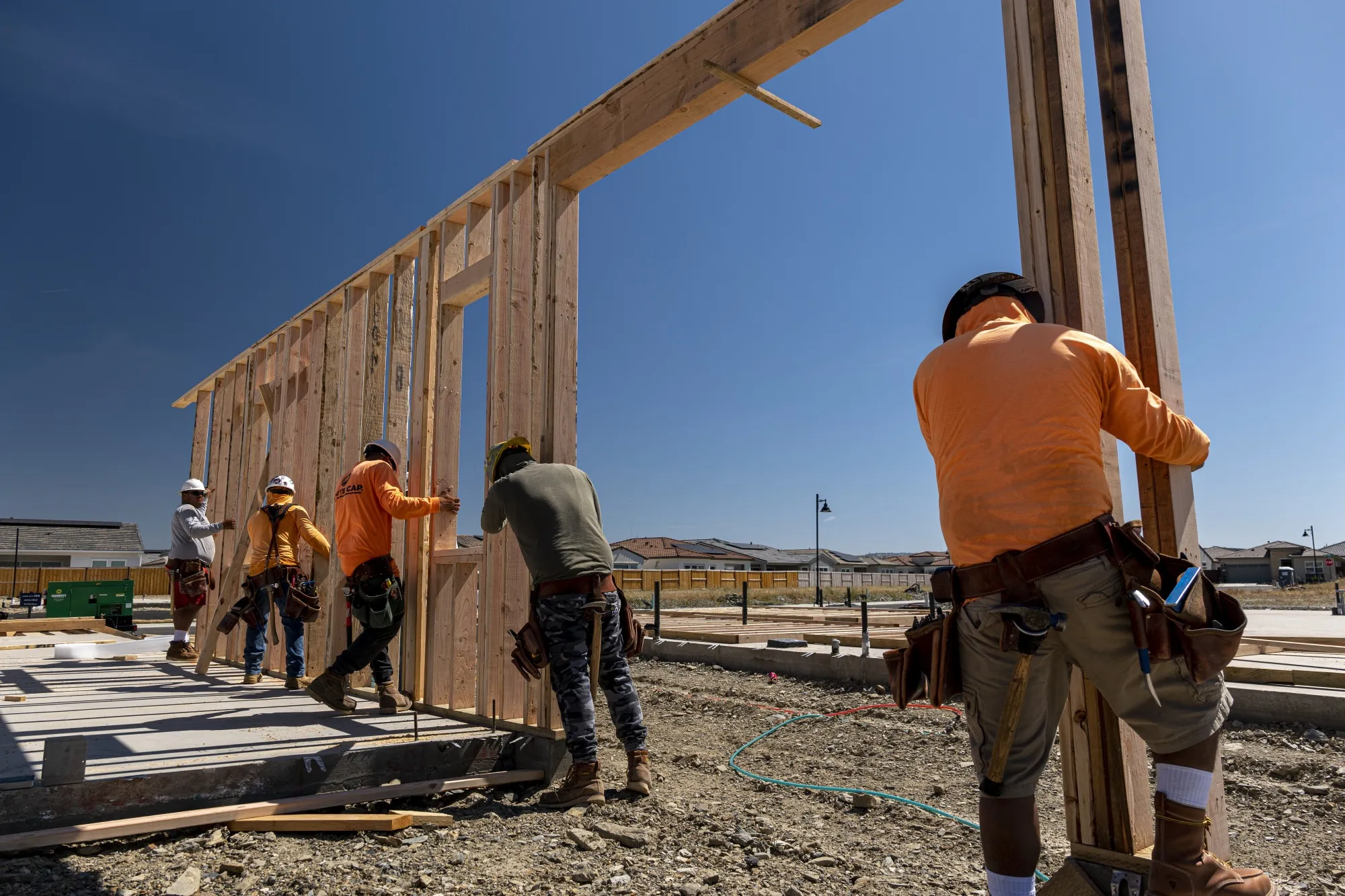 工人們正在加利福尼亞州福爾瑟姆市的一處建築工地上搭建房屋框架牆。