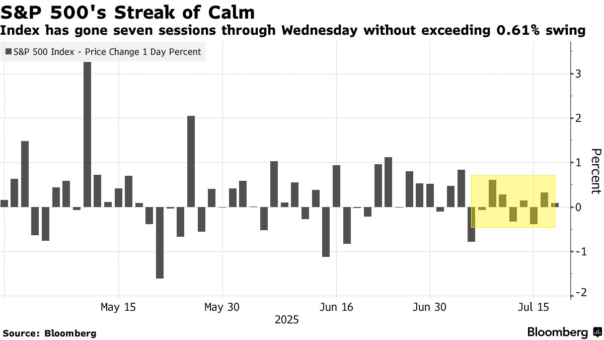 隨着美聯儲在7月30日利率決定前的本週末進入靜默期,基金經理們正在思考什麼因素可能打破標普500指數近期的窄幅波動。根據彭博彙編的數據,截至週三,該指數已連續七個交易日漲跌幅未超過0.61%。