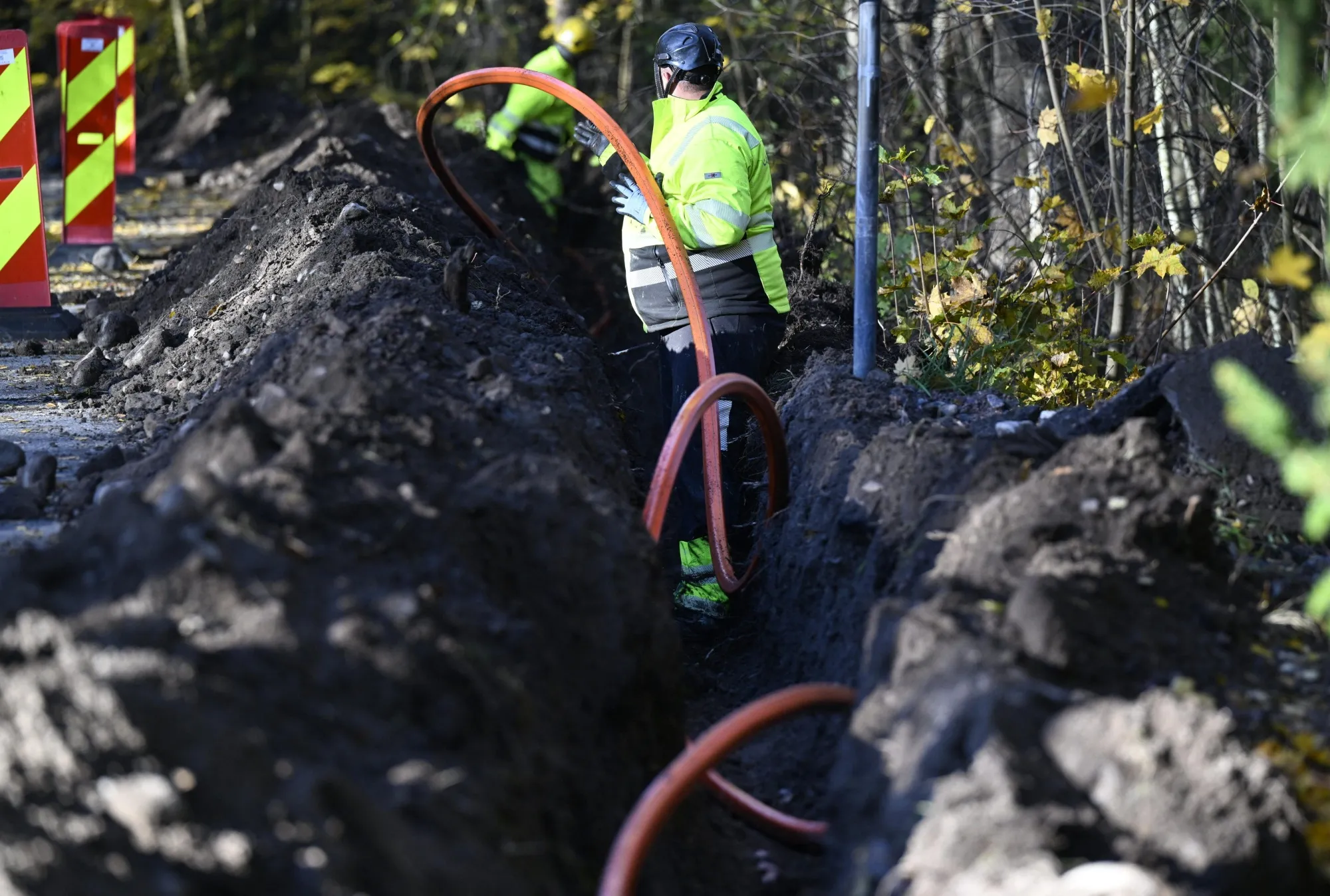 一名工人在芬蘭埃斯波鋪設地下光纖電纜。