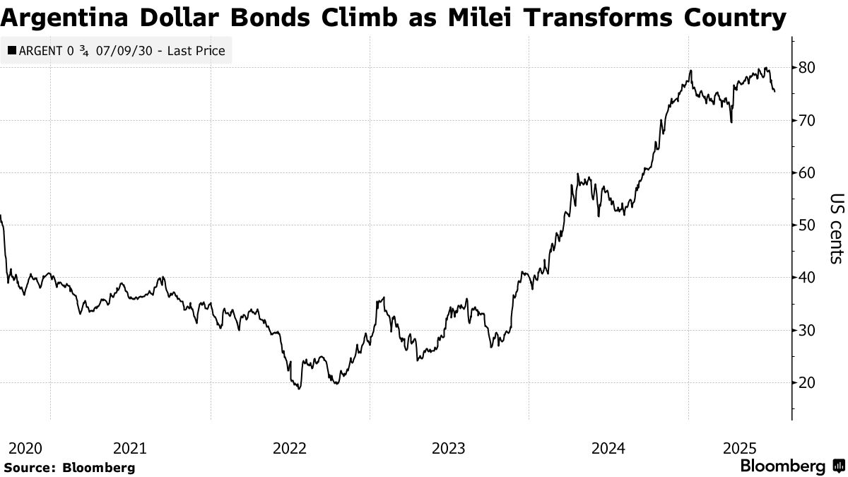 米萊的政策已將月度物價漲幅控制在2%以下,年通脹率目前處於2020年以來的最低水平。他還使該國在2025年有望實現基本盈餘,這是15年來的首次,從而減輕了債務負擔。今年經濟恢復增長,4月份增長了7.7%,超出預期。