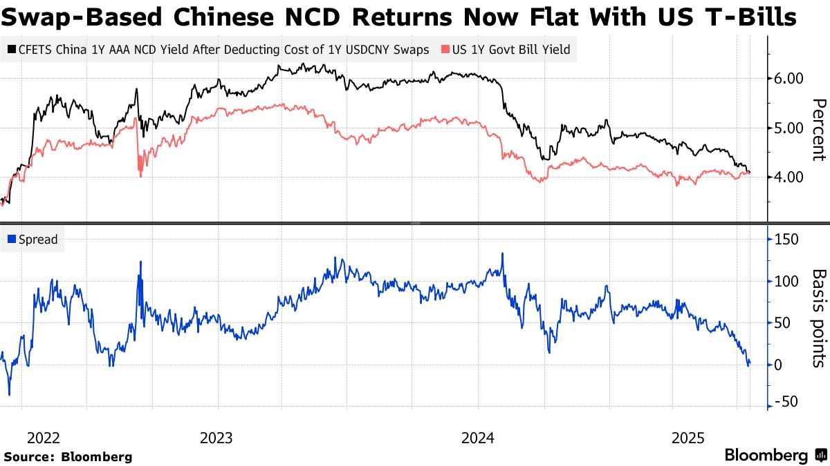 根據彭博計算,外國投資者將美元兑換成人民幣併購買12個月期中國可轉讓存單的總回報率本週暴跌至約4%,自2023年2月以來首次抹平了相對於美國國債的收益率溢價。這表明這些中國票據對尋求額外無風險回報的離岸買家已不再具有吸引力。