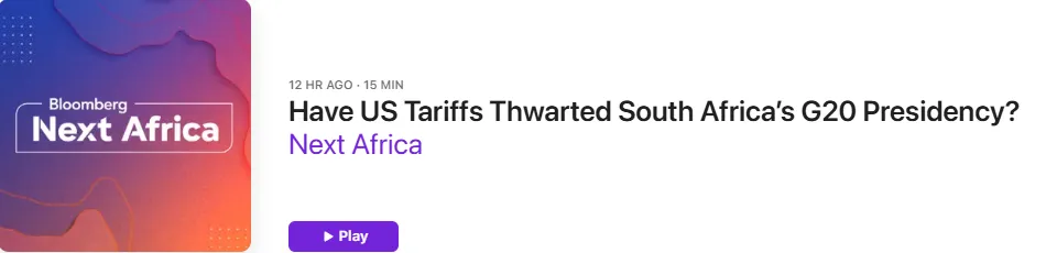 在本週的《非洲展望》播客中,詹妮弗·扎巴薩賈與南非央行行長萊塞特賈·克甘亞戈探討了全球貿易戰的影響,彭博經濟學家伊馮娜·姆漢戈則解析了最新關税舉措對非洲大陸各國的影響。### 新聞摘要