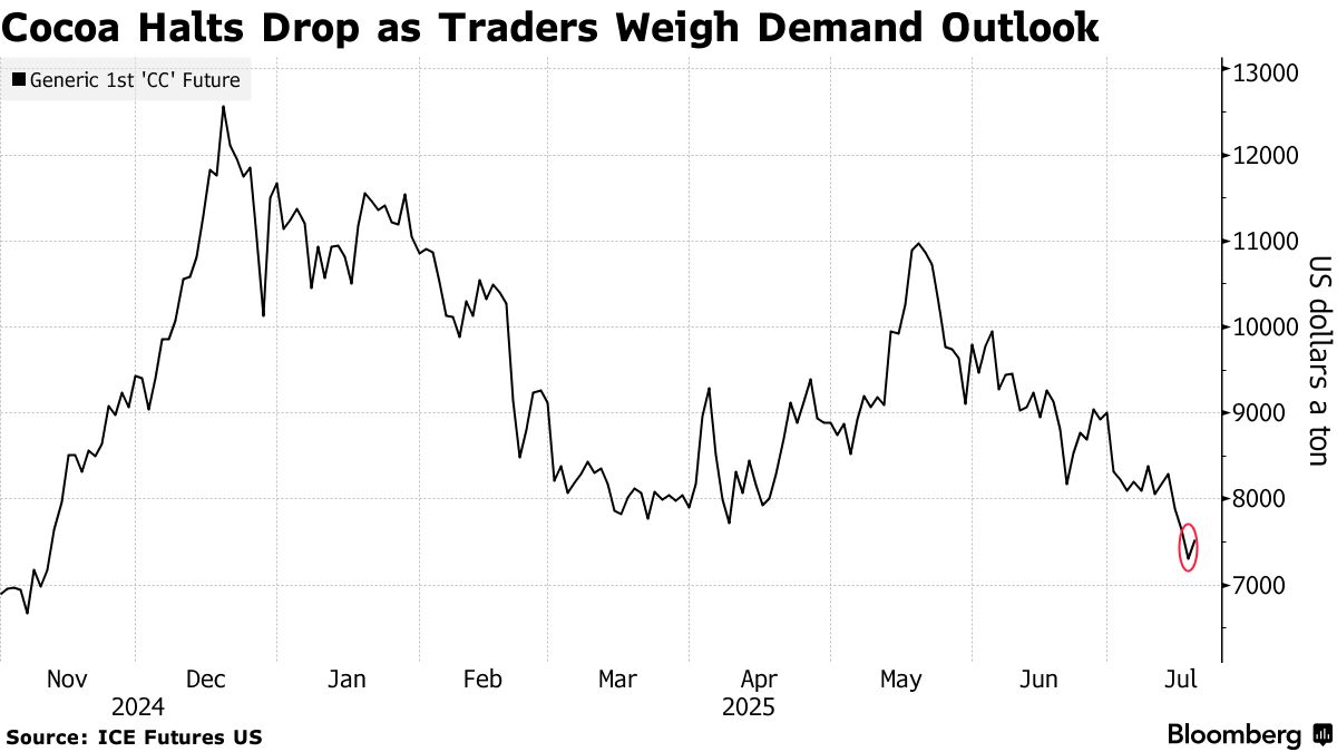 紐約主力合約一度上漲5.8%至每噸7,735美元,使周跌幅收窄至約7%。本週市場持續評估歷史高位可可價格對需求破壞的程度,期貨價格持續承壓。