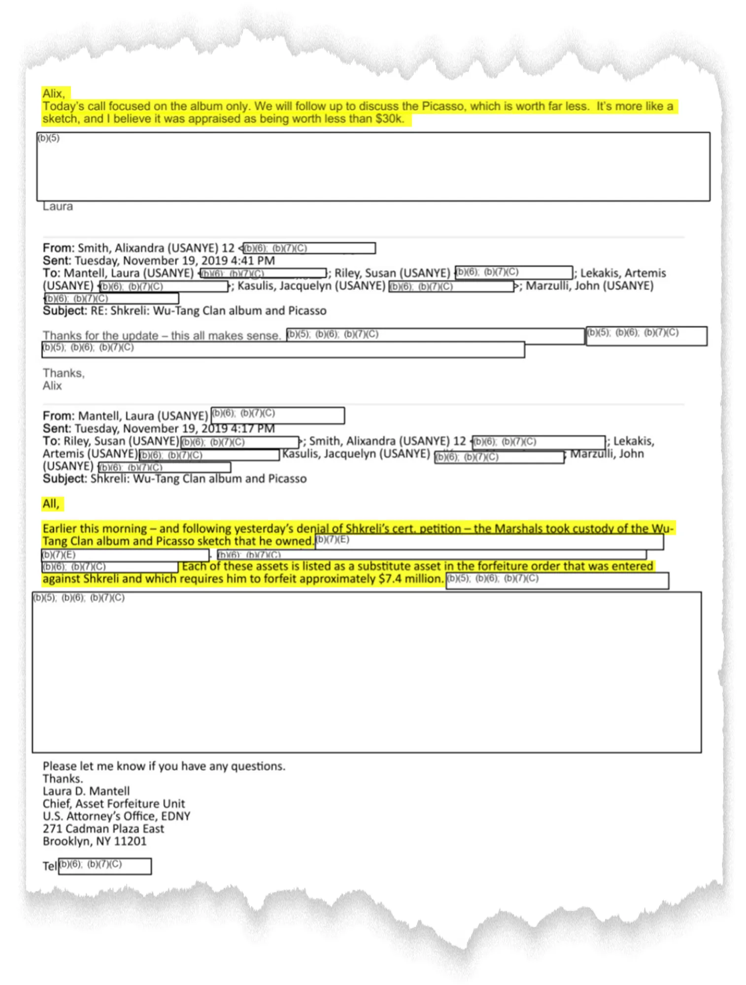 2019年11月紐約聯邦檢察官辦公室資產追回部門負責人的郵件指出,Shkreli還擁有一幅畢加索畫作,該畫作後來也被美國政府沒收。司法部解釋説處理剩餘記錄將耗費很長時間。於是我做了件破天荒的事——告知律師願意放棄獲取剩餘郵件,以便他們就我們認為司法部不當使用商業秘密和隱私豁免條款提出質疑。負責我《信息自由法》案件的政府律師表示將抵制我的訴求。