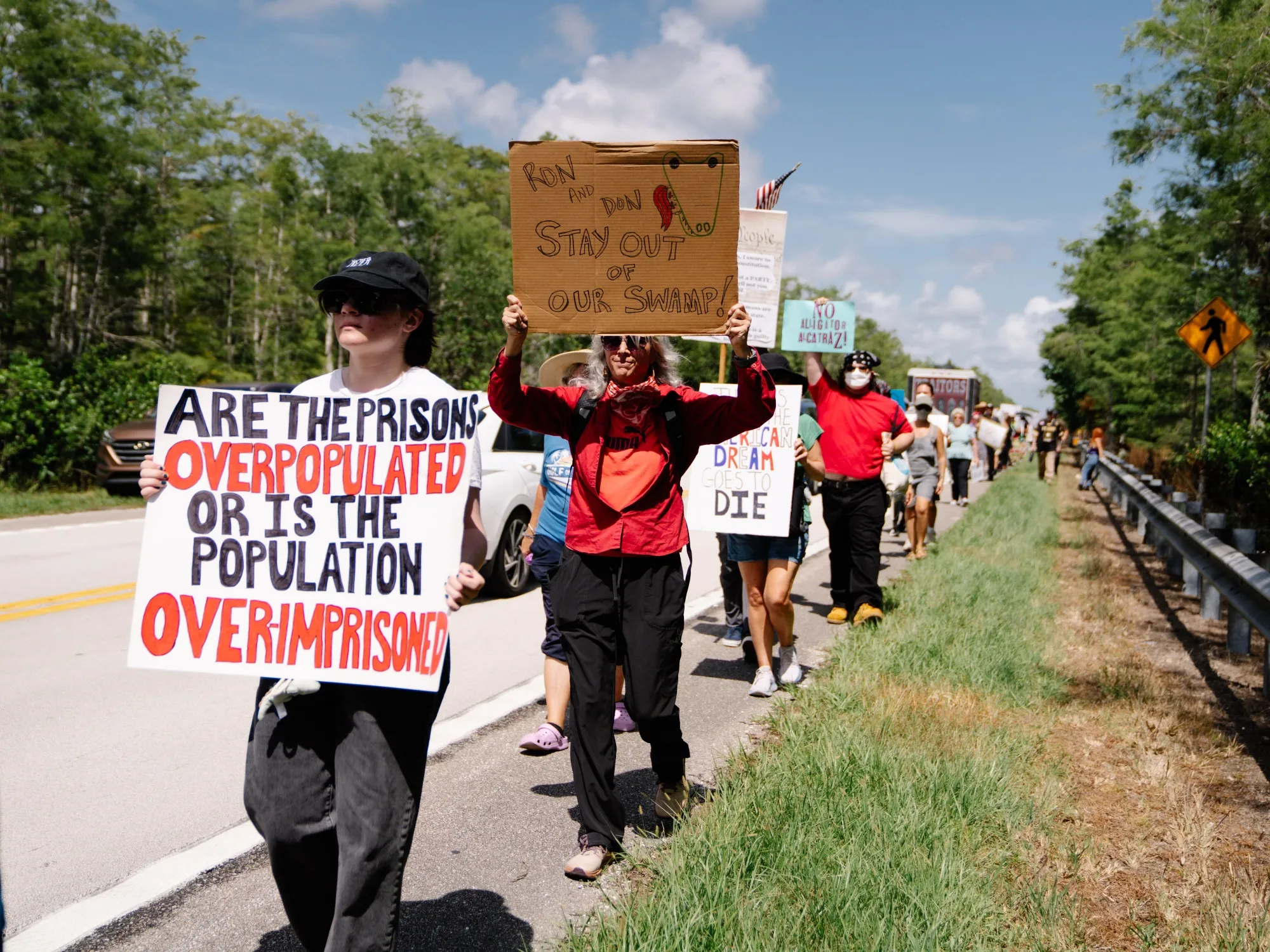 2025年7月1日週二,示威者在佛羅里達州奧喬皮附近的埃弗格萊茲地區抗議一座綽號為"鱷魚惡魔島"的拘留中心建設。攝影師:Martina Tuaty/彭博社根據致國會信函,特朗普政府將臨時在新澤西州和印第安納州的軍事基地安置移民,此舉標誌着國防部在移民執法歷史性擴張中的角色進一步深化。