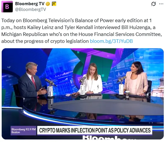 今天下午1點,彭博電視台的權力平衡早間節目中,主持人Kailey Leinz和Tyler Kendall採訪了密歇根州共和黨人、眾議院金融服務委員會成員Bill Huizenga,討論了加密貨幣立法的進展。