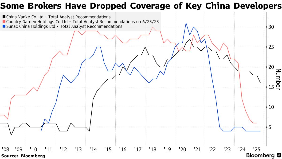 鑑於預期如此低迷,許多市場參與者正全面撤離該板塊。根據彭博彙編的數據,在覆蓋中國最大房企之一萬科企業股份有限公司的20家券商中,已有6家停止更新該公司研究報告。這家總部位於深圳的企業本月稍早稱,其2025年上半年虧損可能達到16.7億美元。