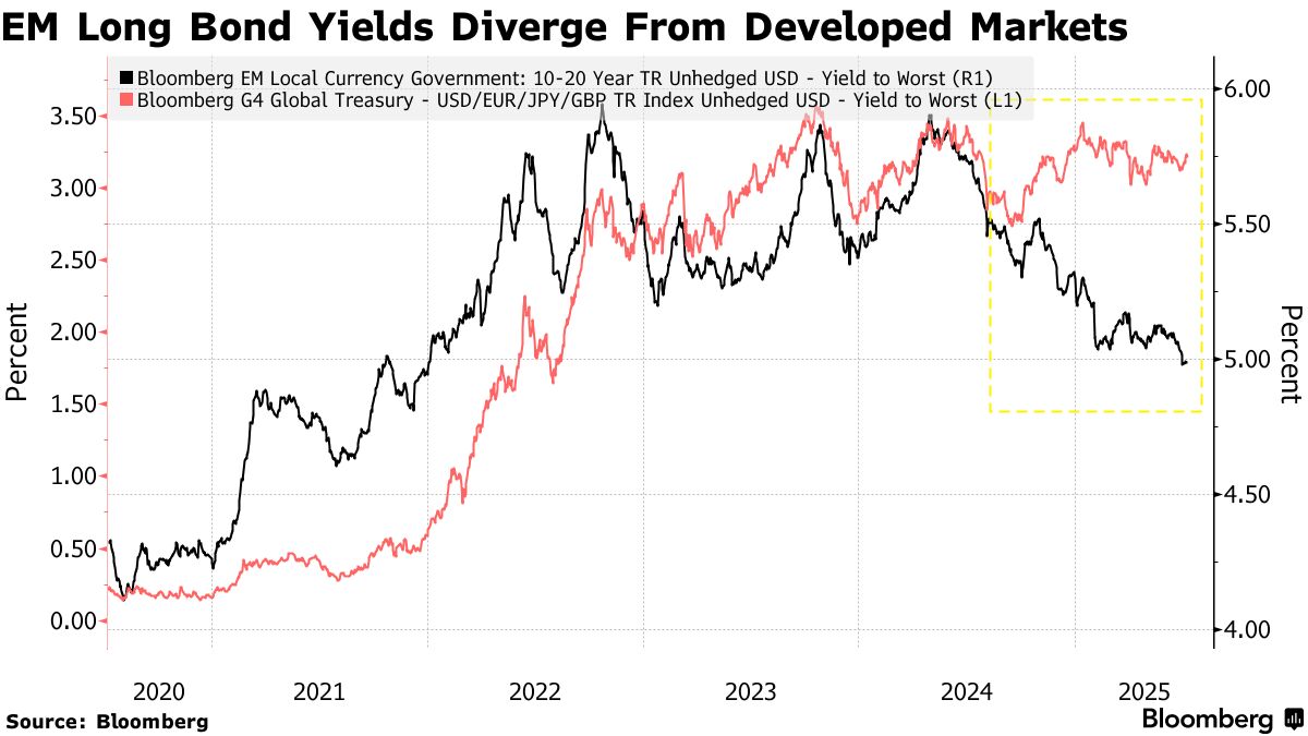 擔憂財政赤字上升的債券投資者正轉向一個不尋常的避風港:新興市場。儘管隨着投資者對政府支出日益警惕,發達市場長期債券今年承壓,但亞洲新興市場債券已成為熱門選擇。
