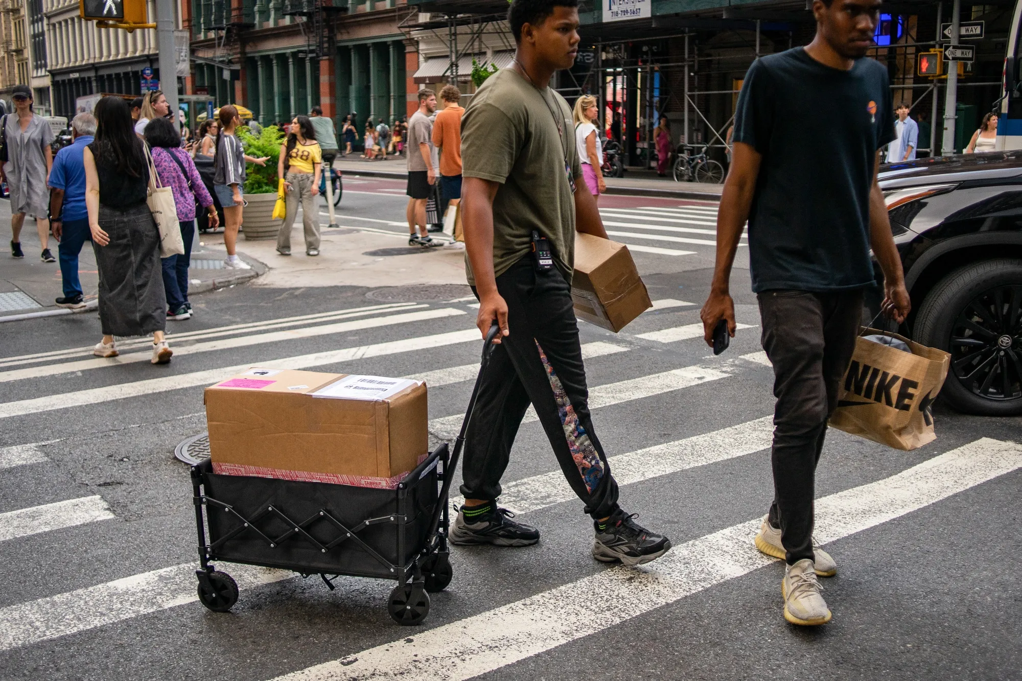 紐約蘇豪區百老匯大街上的購物者與外賣配送員。