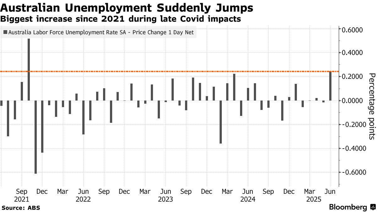 澳大利亞6月失業率意外攀升至四年高位,就業增長近乎停滯,表明勞動力市場正在鬆動,這為澳大利亞儲備銀行下月降息提供了更多理由。在兼職崗位推動下,就業人數增加了2000人,遠低於經濟學家預期的2萬人增幅。