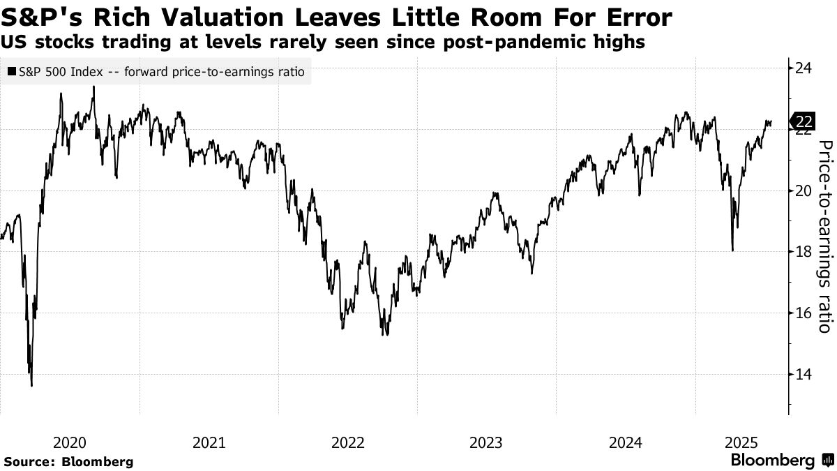 標普500指數週五收盤逼近歷史高點,在短短15個交易日內七次刷新紀錄。該股指當前市盈率達22倍(基於未來12個月預期盈利),正快速逼近今年2月水平——彼時在4月2日特朗普總統宣佈影響市場情緒的全球關税政策前。