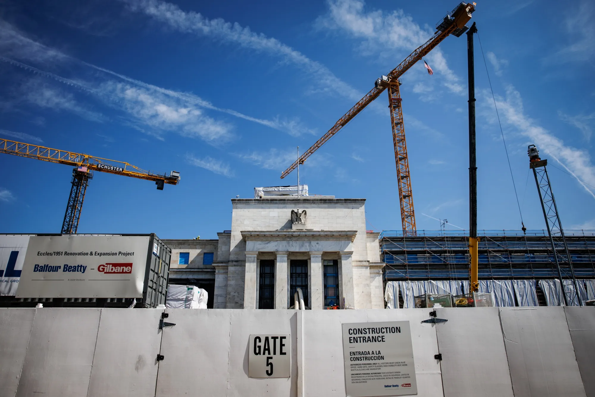 華盛頓紀念碑後方正在施工的聯邦儲備委員會東大樓,前身為美國公共衞生局大樓。攝影師:阿爾·德拉戈/彭博社美聯儲所在的1937年曆史建築及相鄰的1931年聯邦大樓正在進行翻修擴建工程,這項長期延誤的改造項目自2023年以來成本已上漲超30%。