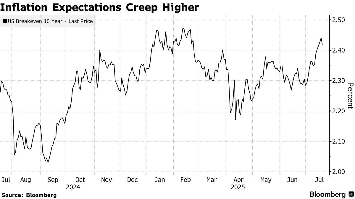 上週,反映投資者通脹預期的10年期盈虧平衡利率已上升0.03個百分點至2.42%,接近2月以來的最高水平。