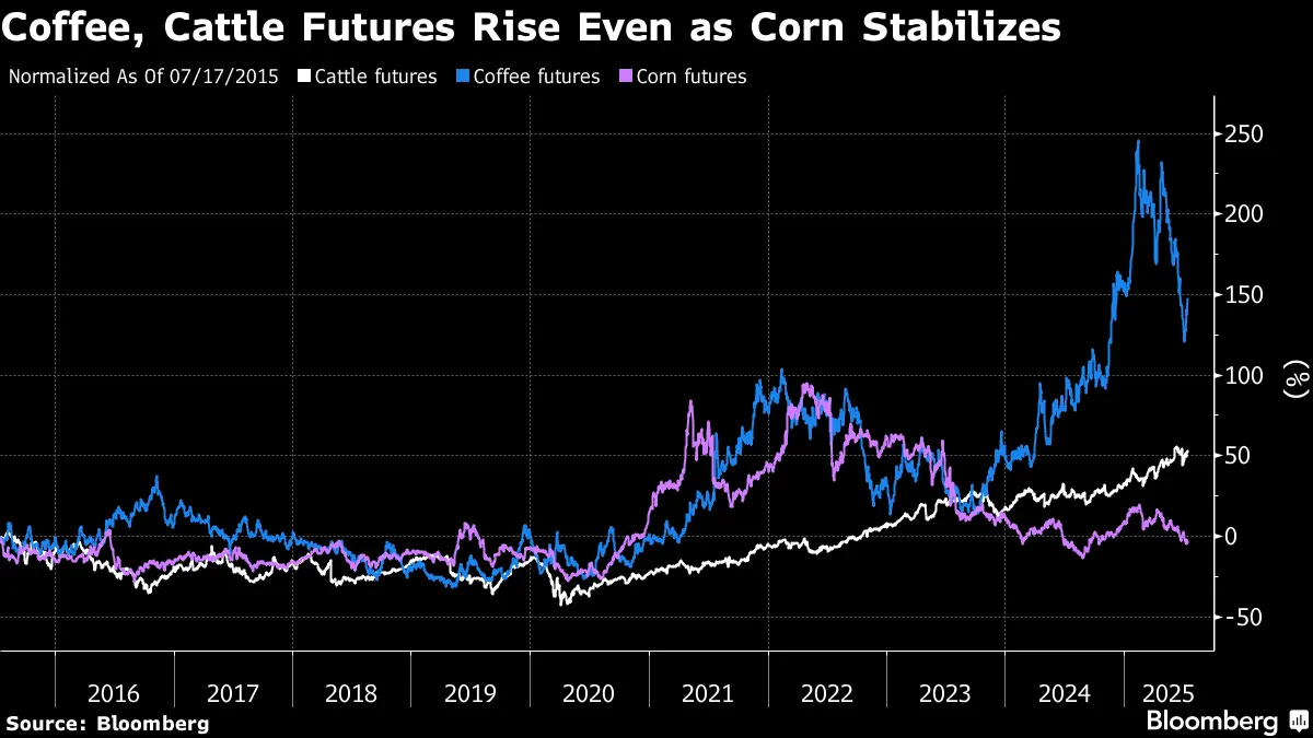 但咖啡和活牛等產品例外,因其需要熱帶氣候或大片放牧地等特定條件,限制了種植和養殖範圍。代表這些市場近期價格的咖啡和活牛期貨合約自2020年以來持續上漲,而玉米等更易種植的作物期貨則呈相反趨勢。