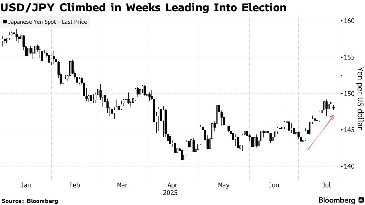 攝影師:Toru Hanai/彭博社日本執政聯盟在週末的參議院選舉中遭遇歷史性挫敗後,日元走強,為政治不確定性埋下伏筆。亞洲市場料將迎來漲跌互現的開局。
