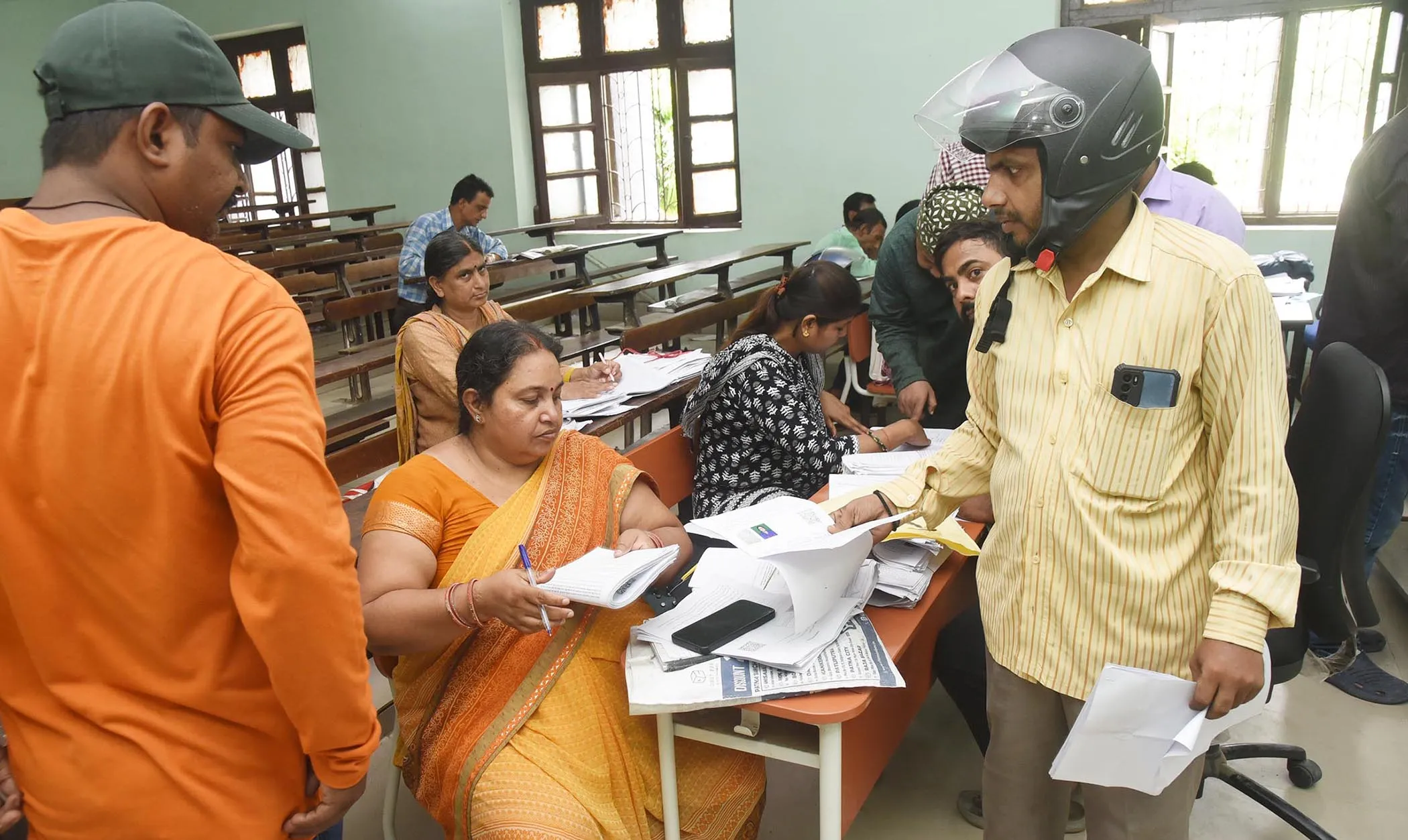 7月13日,巴特那市正在進行選民名冊特別集中修訂期間,官員正在核驗選民證件。攝影師:桑託什·庫馬爾/印度斯坦時報/蓋蒂圖片社