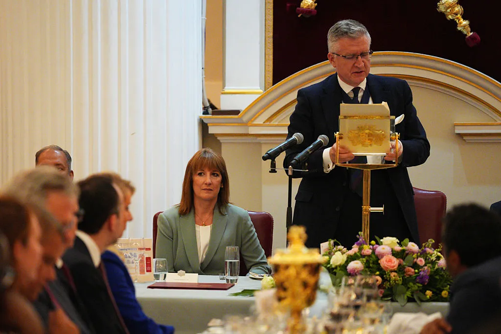 7月15日,財政大臣瑞秋·裏夫斯在倫敦金融城官邸舉行的金融服務晚宴上聆聽倫敦市長阿拉斯泰爾·金的講話。