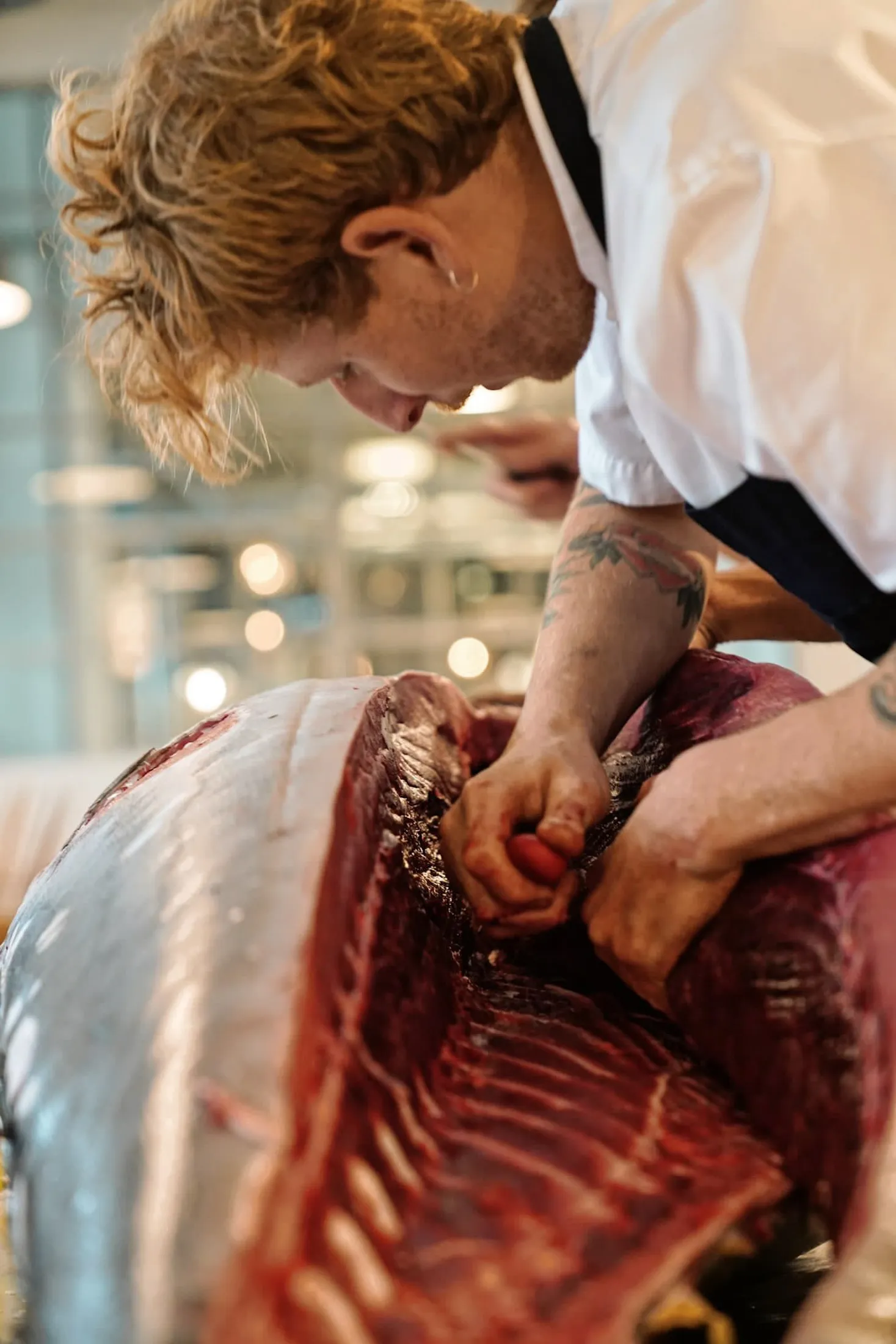 解剖這種昂貴的魚類——尤其是重達400磅的龐然大物——絕非易事。“我的廚師團隊幾乎沒人有處理經驗,而且每個部位都有不同的名稱,“洛説道。他們平時使用的刀具甚至都不適合這項任務。
