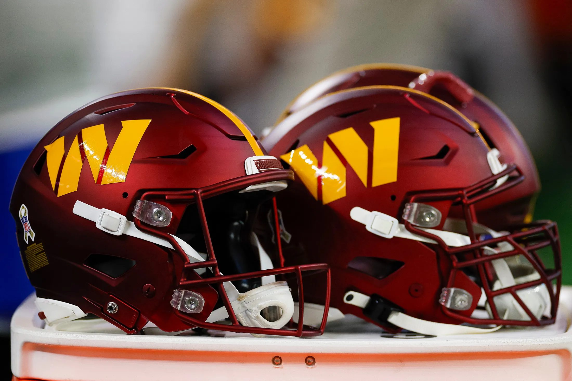 華盛頓指揮官隊球員頭盔上的標誌。攝影師:Brandon Sloter/Getty Images特朗普威脅阻止華盛頓指揮官隊的新體育場計劃,除非球隊將名稱改回紅皮隊。總統聲稱有來自美洲原住民的“強烈呼聲”要求恢復舊稱。