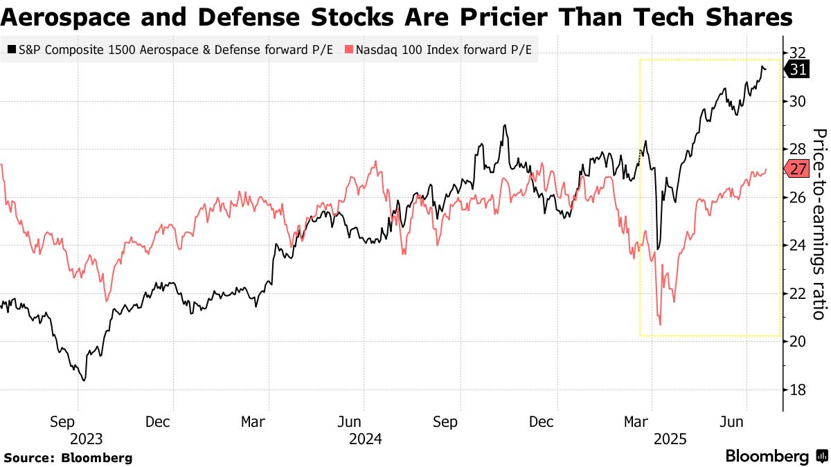 航空航天與國防指數的遠期市盈率達到31倍,而以科技股為主的納斯達克100指數為27倍。