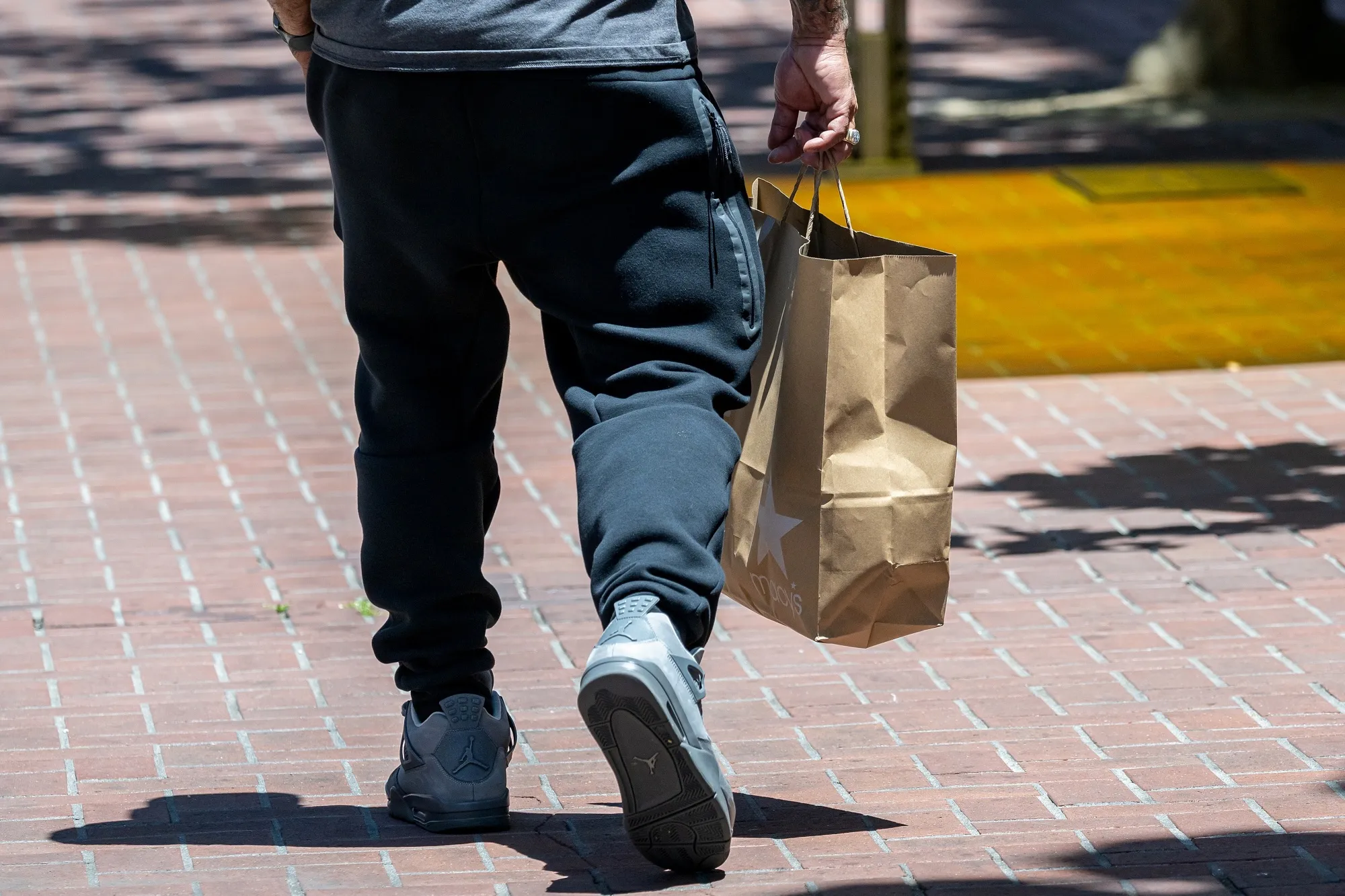 美國加利福尼亞州舊金山,一位購物者提着梅西百貨的購物袋。