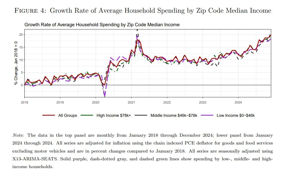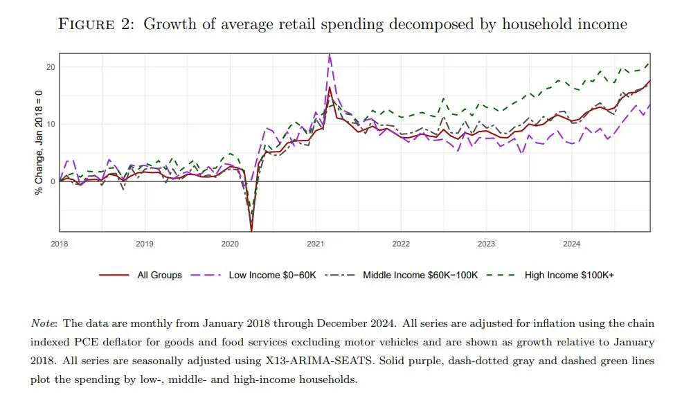 “在經濟學中,使用郵政編碼區域收入中位數作為家庭收入代理指標的做法很常見,但這可能掩蓋異質性並導致誤導性結論。當我們使用自報收入數據時,可以觀察到從2021年中開始,低收入與高收入家庭支出出現顯著分化。而使用郵政編碼聚合數據作為代理指標時,這種分化就消失了。”