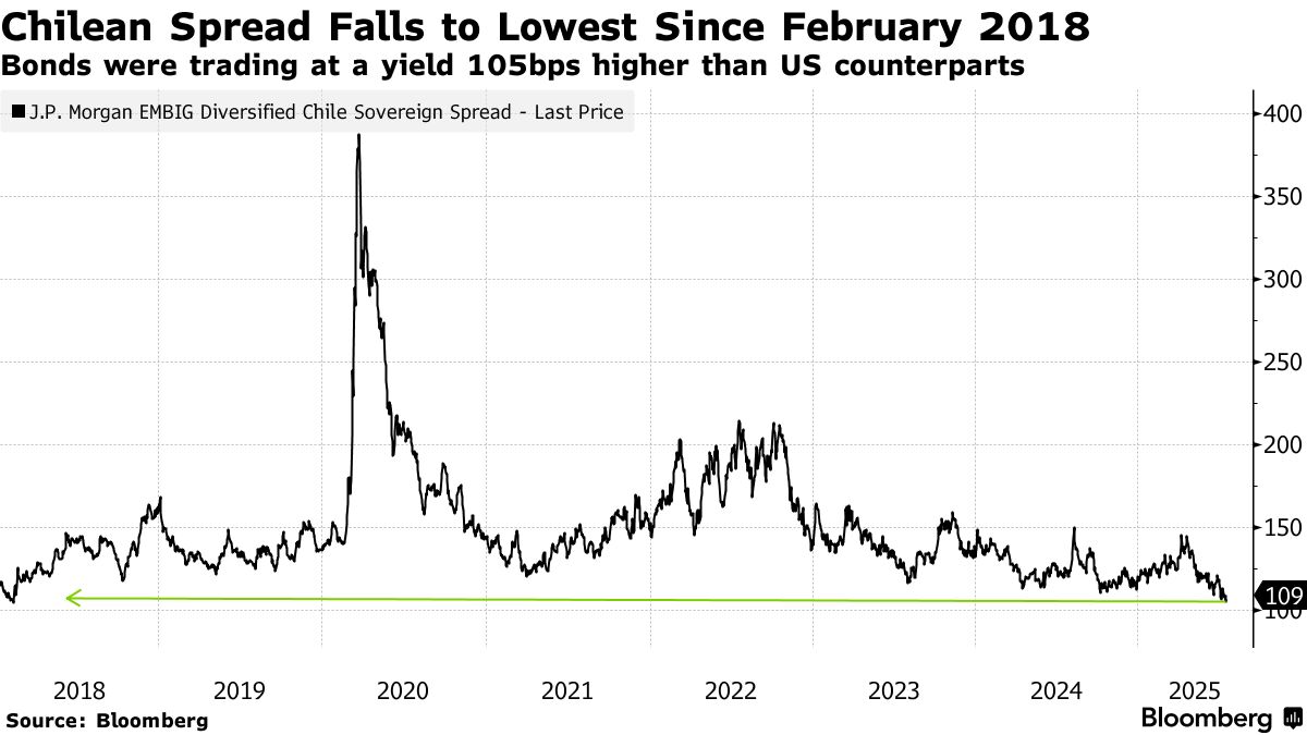 進一步壓縮至100個基點以下可能更多取決於美國而非智利的動態。如果在關税影響下通脹開始上升,或者財政赤字進一步擴大,美國國債收益率可能上升,利差將收窄。