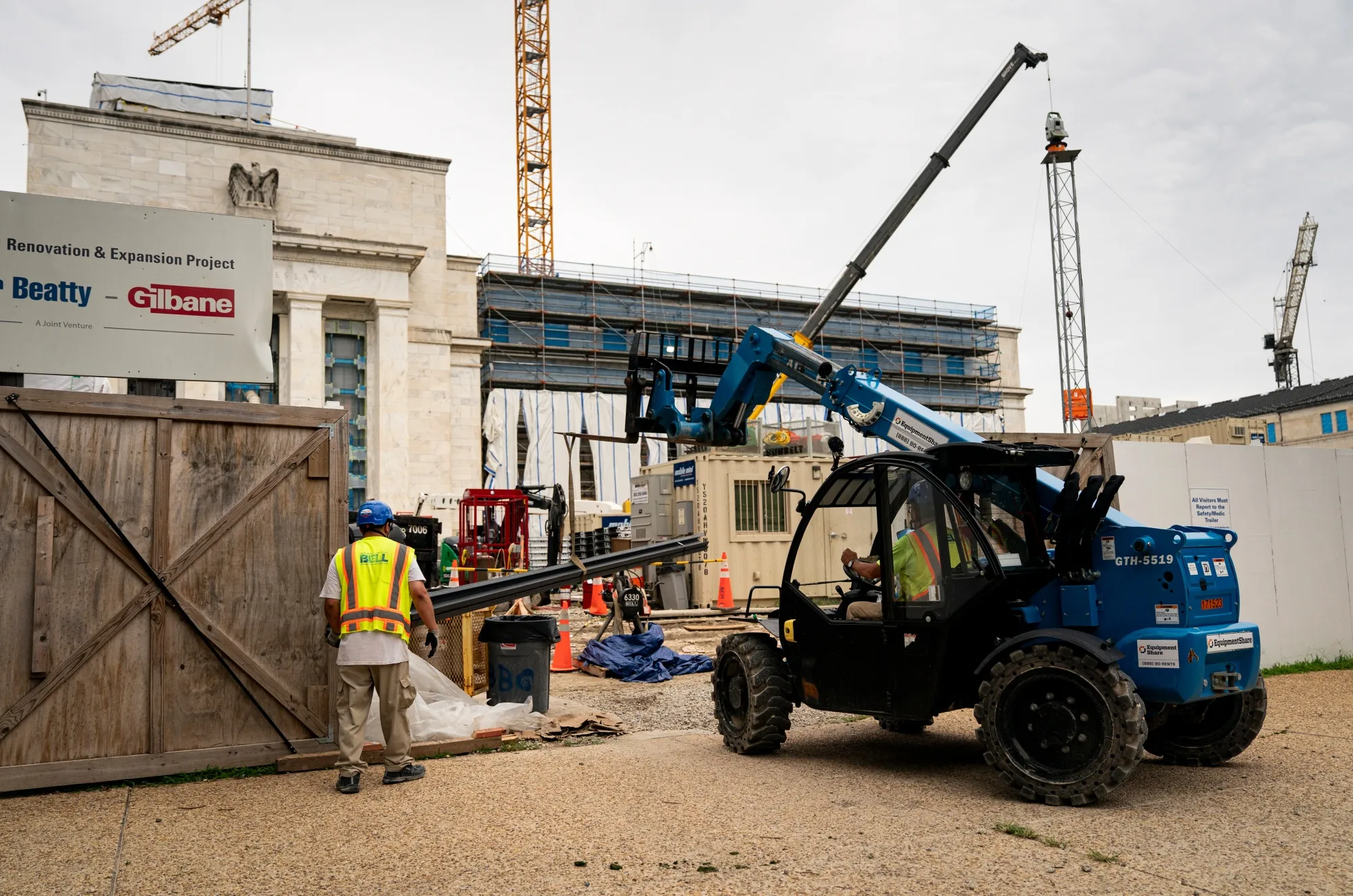 2025年7月21日週一,華盛頓馬里納·S·埃克爾斯聯邦儲備大樓施工現場。攝影師:阿爾·德拉戈/彭博社白宮辦公廳副主任詹姆斯·布萊爾上週晚些時候向記者表示,美聯儲已邀請政府官員參觀施工現場。布萊爾是特朗普近期任命的三位白宮官員之一,他們將加入負責審批此類項目的聯邦機構國家首都規劃委員會。