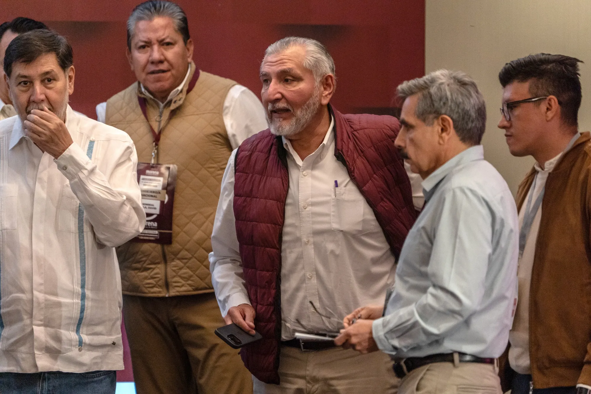 2025年7月20日週日,墨西哥城莫雷納黨全國委員會會議上,阿丹·奧古斯托·洛佩斯參議員(中)正在發言。攝影師:亞歷杭德羅·塞加拉/彭博社一起波及墨西哥執政黨高層的政治醜聞持續發酵,或將破壞總統克勞迪婭·辛鮑姆精心打造的"犯罪鬥士"形象。克勞迪婭·辛鮑姆精心打造的"犯罪鬥士"形象。