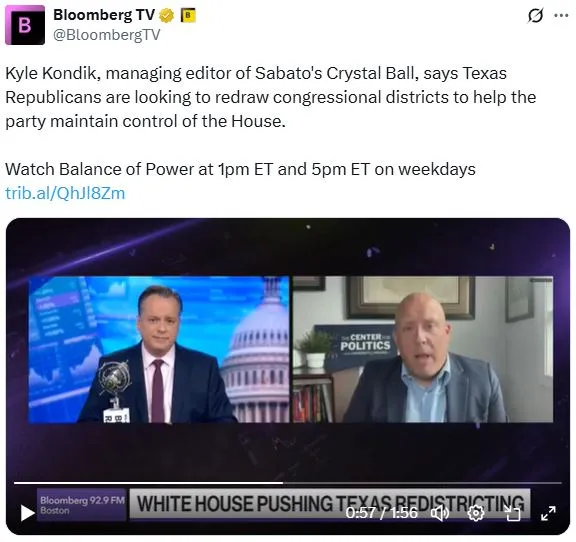 今天下午1點,彭博電視台權力平衡早間版節目中,主持人喬·馬修採訪了弗吉尼亞大學政治中心薩巴托水晶球執行編輯凱爾·康迪克,探討了德克薩斯州和加利福尼亞州為黨派利益重劃國會選區的努力。