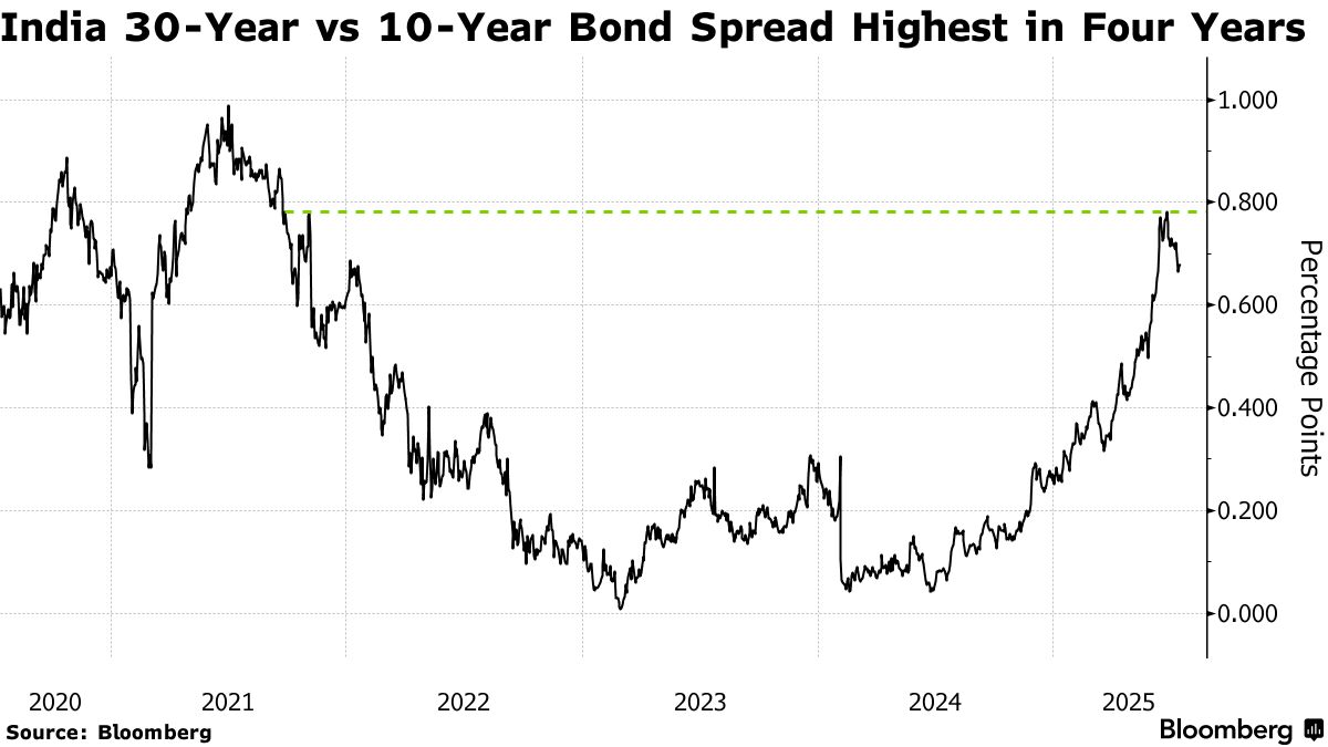 印度儲備銀行上個月意外將關鍵政策利率下調50個基點,並轉向"中性"立場,令市場感到意外。這一轉變已將30年期債券收益率推高至近7%,而基準10年期債券收益率為6.3%,因為投資者要求更高回報以持有更長期限債券。