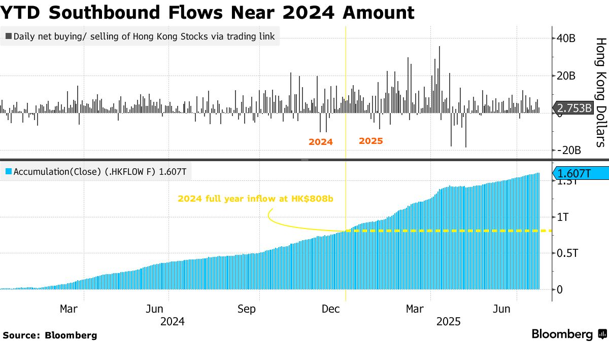 週二南向資金淨流入再增27億港元(3.44億美元),使今年總流入達8000億港元,僅略低於2024年創下的8080億港元歷史峯值。