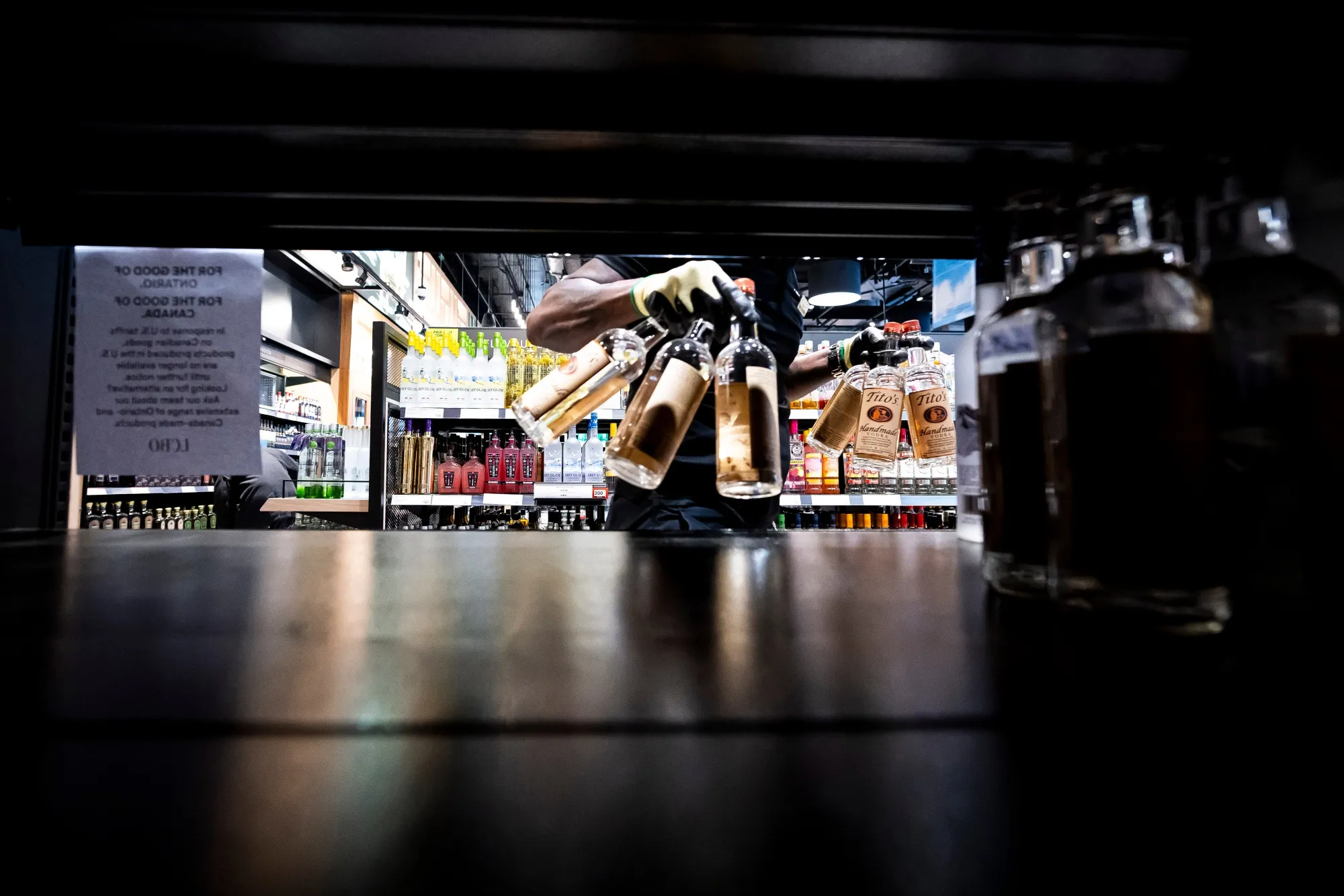 3月4日,多倫多安大略省酒類管制局商店內,工作人員正從貨架撤下美國製造的蒂託伏特加。攝影師:克里斯托弗·卡察洛夫·盧納/彭博社隨着加拿大飲酒者完全避開酒類商店,整體市場正在萎縮。4月份烈酒品類同比下滑3.3%,銷售額降至4.055億加元。