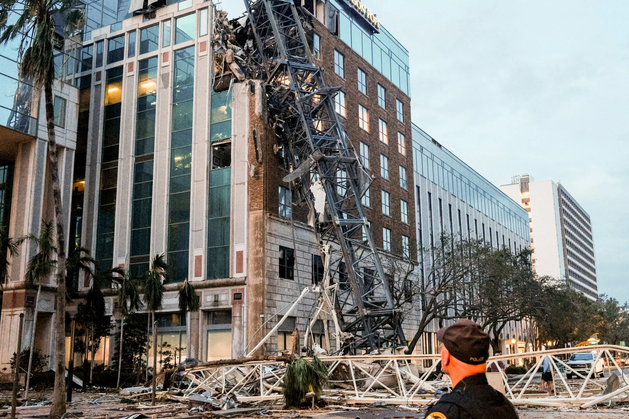 2024年10月颶風"米爾頓"登陸聖彼得堡後倒塌的起重機。攝影師:特里斯坦·惠洛克/彭博社公寓的銷售恰逢2024年異常嚴重的颶風季節對墨西哥灣中部海岸造成重大破壞之後。為緩解買家顧慮,開發商大力宣傳該項目距離水域僅幾百英尺的抗風暴設計。