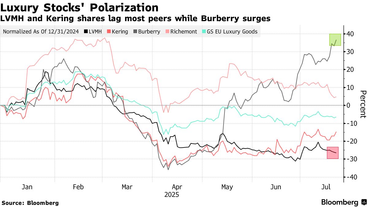 對於整個行業而言,當前形勢與2021至2023年的繁榮時期形成鮮明對比——當時投資者爭相搶購歐洲奢侈品股票,坐享後疫情時代消費者報復性消費帶來的紅利。但隨着中國經濟疲軟抑制了高價手袋和手錶的需求,投資者正買入能吸引消費者的品牌股票,拋售那些缺乏吸引力的品牌。