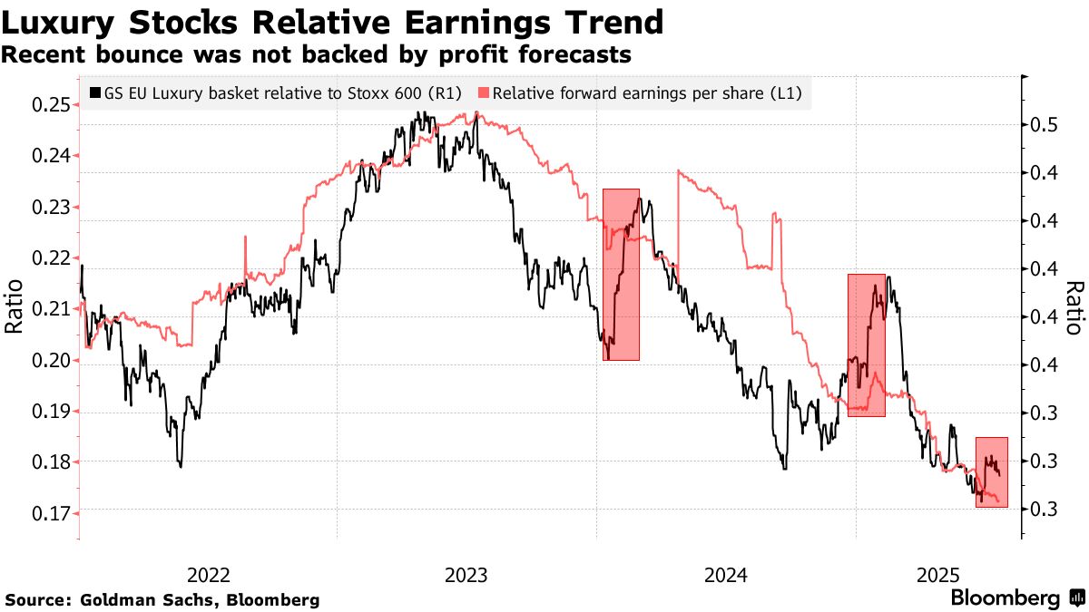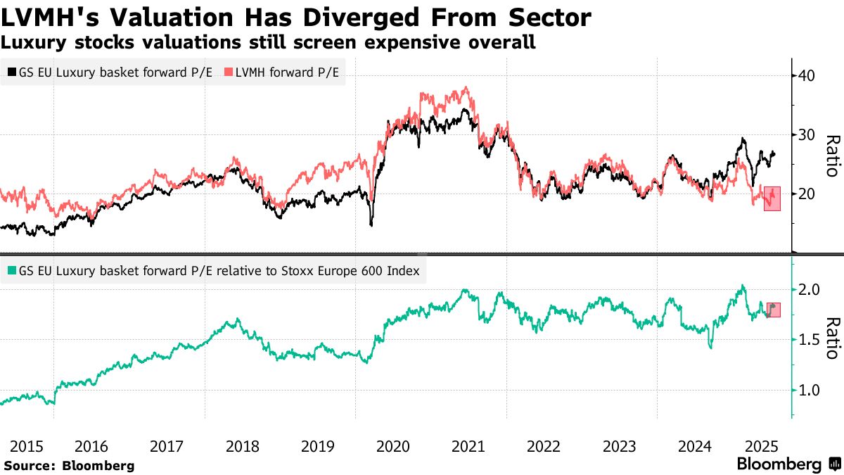 部分投資者認為,即便經歷今年股價大跌,奢侈品行業整體估值仍偏高。彭博彙編數據顯示,該行業平均遠期市盈率達27倍,較整體市場溢價近85%,也高於過去十年的長期溢價水平。