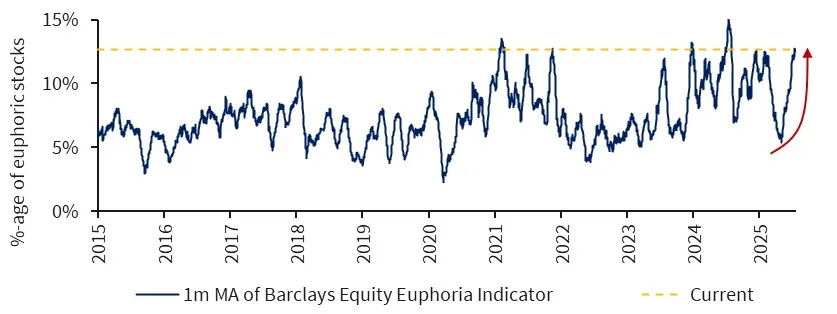 上週,巴克萊股票狂熱指標(利用期權數據量化投資者亢奮程度)躍升至去年12月底以來最高水平。