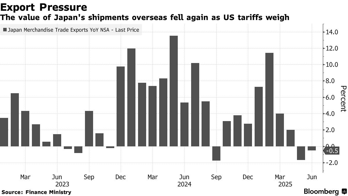 由於汽車和鋼鐵出貨量大幅下滑,日本6月出口連續第二個月下降。上月汽車製造商將美國出口價格削減19%,創下自2016年有記錄以來最大降幅,通過犧牲利潤率在關税動盪中保持競爭力。高盛經濟學家太田智宏在報告中指出,若這一趨勢蔓延至更廣泛行業,可能對企業利潤造成壓力。