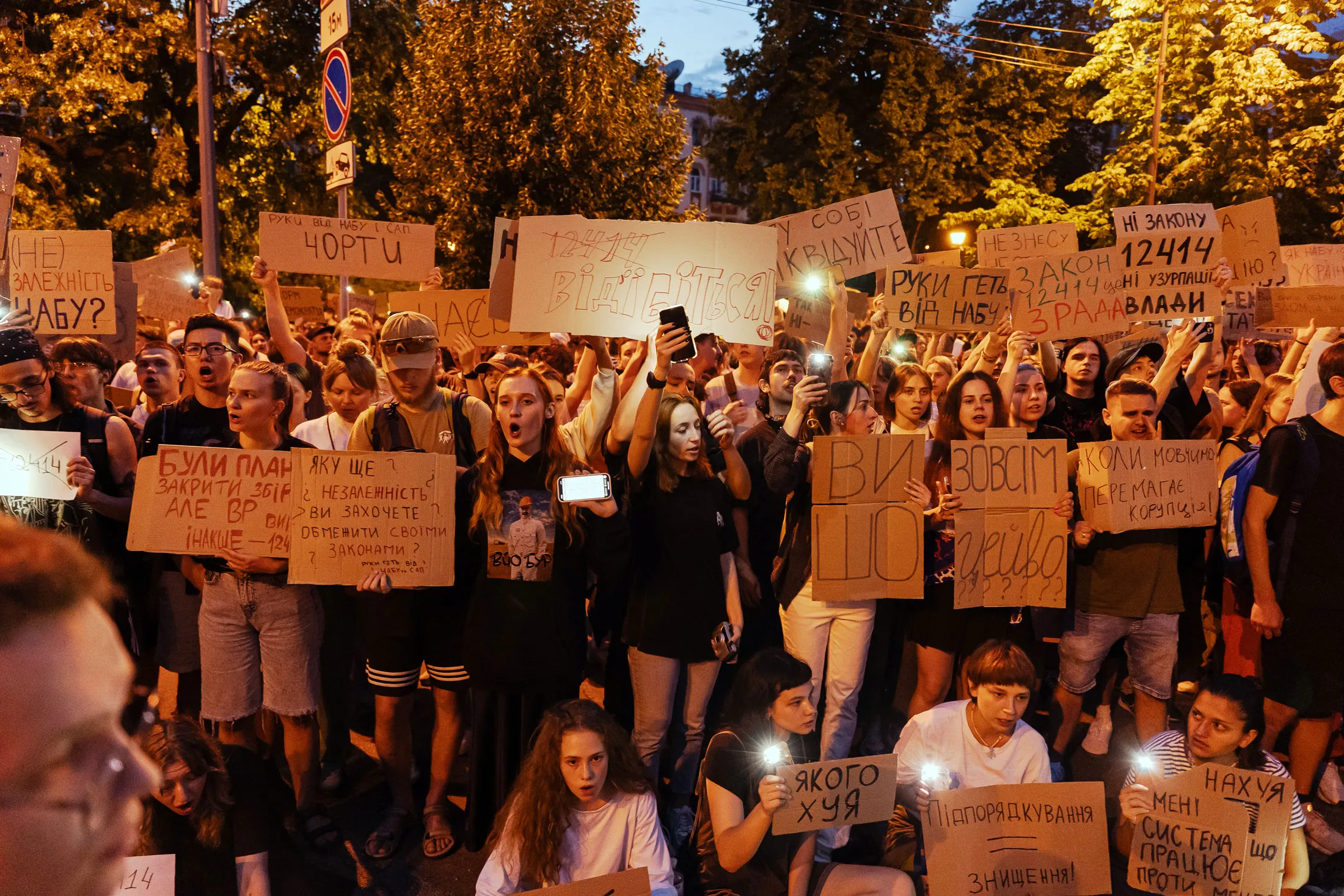 當抗議者揮舞標語和烏克蘭國旗,聚集在基輔、西部城市利沃夫及黑海港口城市敖德薩等地時,澤連斯基辦公室證實他已簽署法案使其生效。