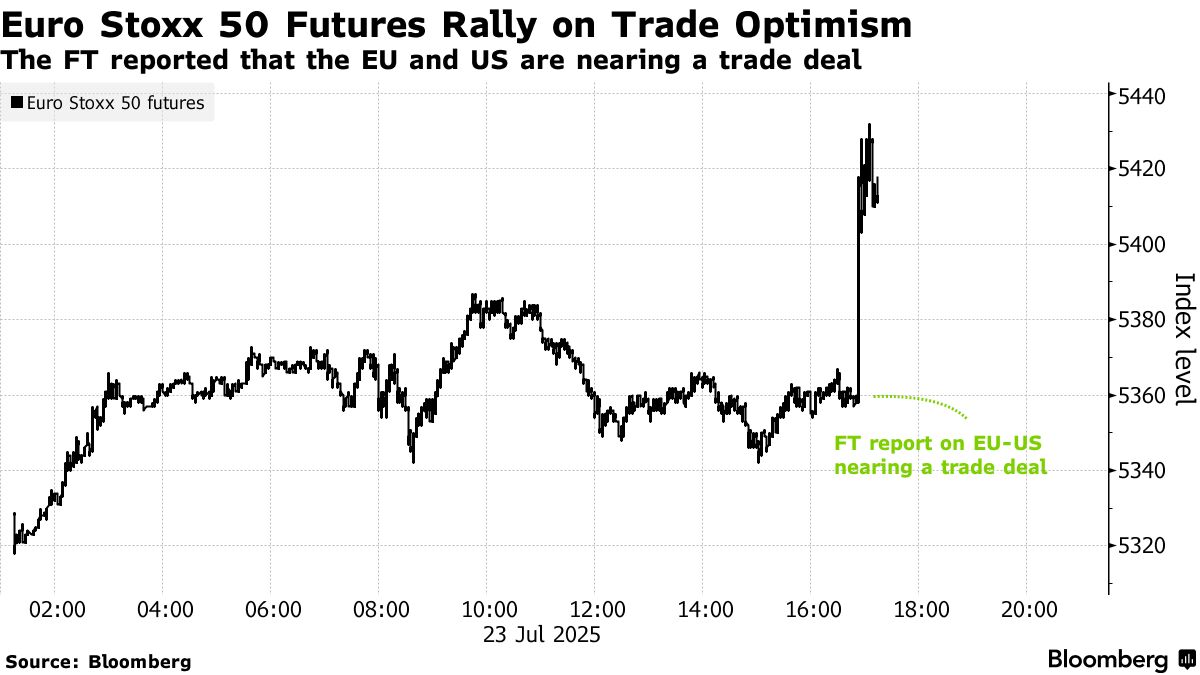 歐洲股指期貨在盤後交易中延續漲勢,因有跡象顯示政策制定者即將達成一項美國貿易協議。