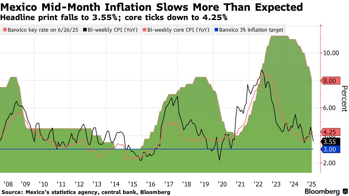 年化通脹率降至3.55%,低於彭博調查經濟學家預測的3.61%中值,也低於此前4.13%的水平,墨西哥國家統計局週四報告稱。剔除食品和燃料等波動性項目的核心通脹率從6月底的4.28%微降至4.25%。