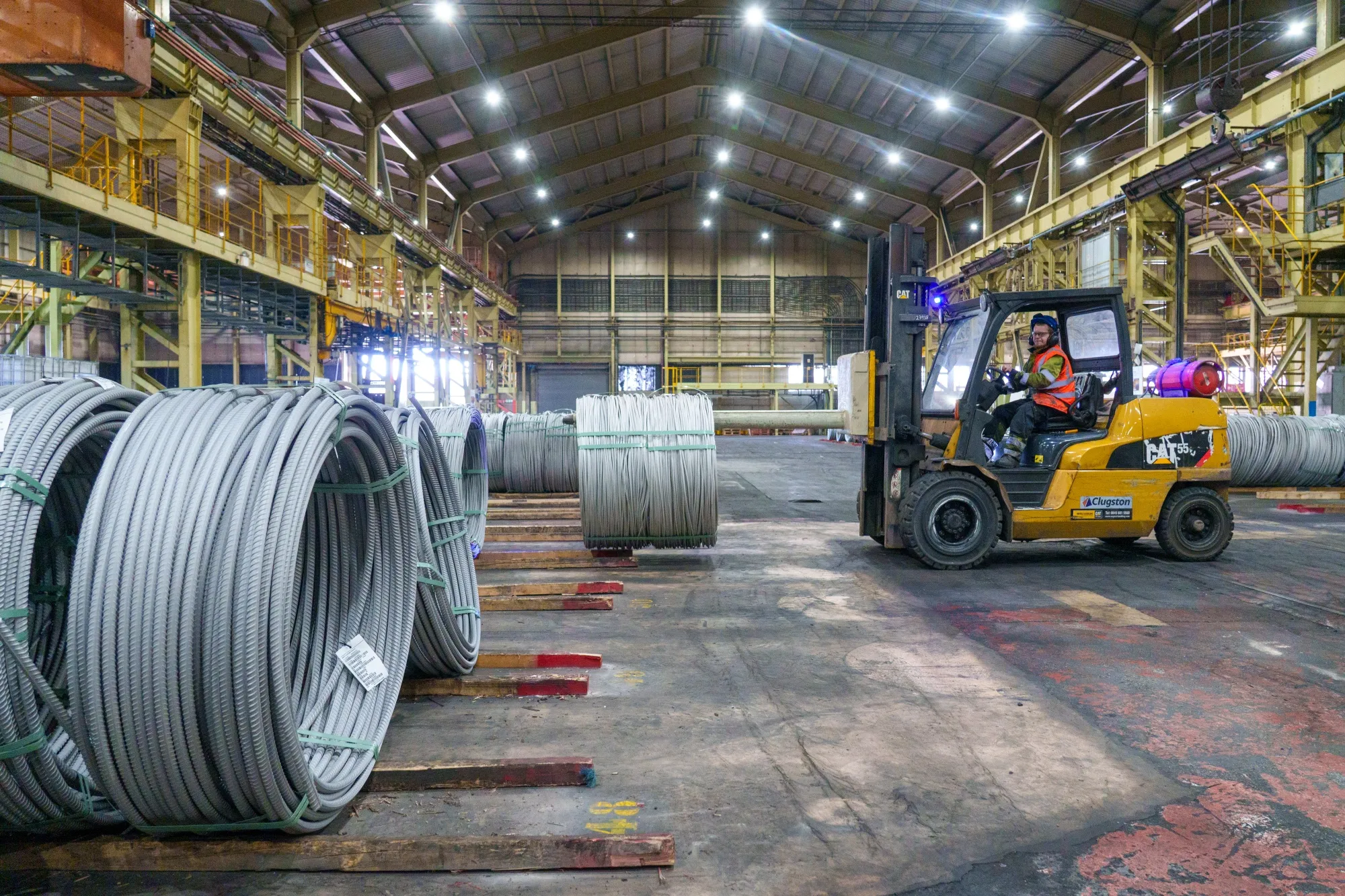 英國謝菲爾德一家鋼條精加工廠內,叉車正搬運不鏽鋼卷材。
