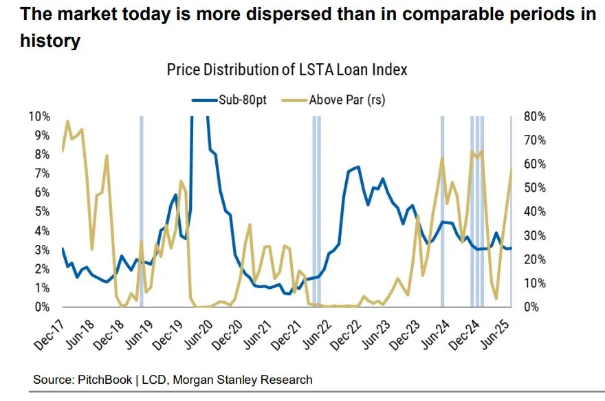 “貸款市場持續走強,投資者基本忽略了關税擔憂。**但與歷史上市場處於相似水平時(如2022年第二季度、2019年第二季度)相比,當前市場呈現出更‘肥’的尾部,更多比例的貸款交易價格低於80點或高於面值。**這種分化凸顯了高利率環境下持續存在的表現分層。”