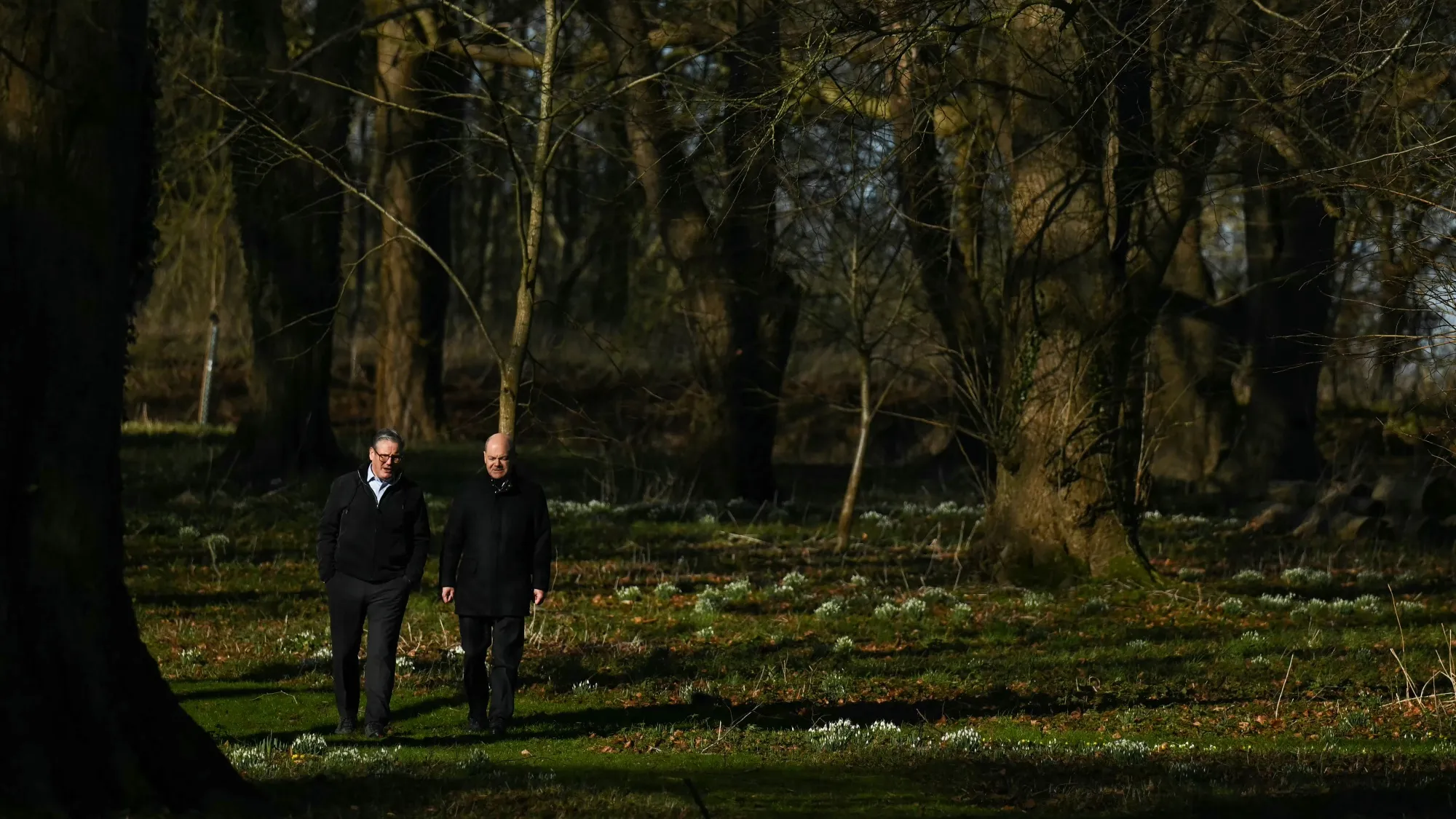 基爾·斯塔默在契克斯莊園花園與奧拉夫·朔爾茨交談。